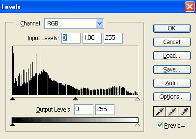 ขั้นตอนที่2 เรามารู้จักกับคำสั่ง Levels กันก่อน คำสั่ง Levels เรียกใช้โดย Menu > Image > Adjust > Levels... เส้นกราฟรูปภูเขาสีดำนั้นเรียกว่า Histogram
